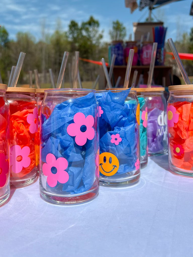 Happy Retro Flowers Glass Can